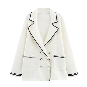 ملابس نسائية كاجوال عتيقة جيدة التهوية للربيع الأبيض محبوك على الوجهين متباين بأكمام طويلة سترة مزدوجة الصدر إغلاق