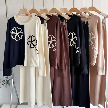 الخريف والشتاء مجموعة واحدة عبر الحدود الأوروبي البلوز الأمريكية السراويل الساق واسعة اللون سدت محبوك أعلى توييد المواد مجموعة فضفاضة